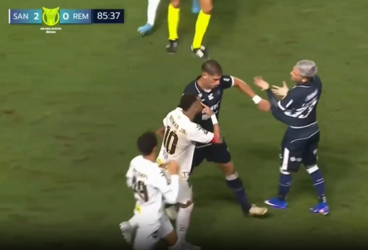 第85分钟,内马尔在短短不到10秒钟的时间,被对手同一名防守球员先是推倒、随后从背后踢倒在地。内马尔不满对手恶意犯规,抗议裁判判罚被出示黄牌,引发两队冲突。
